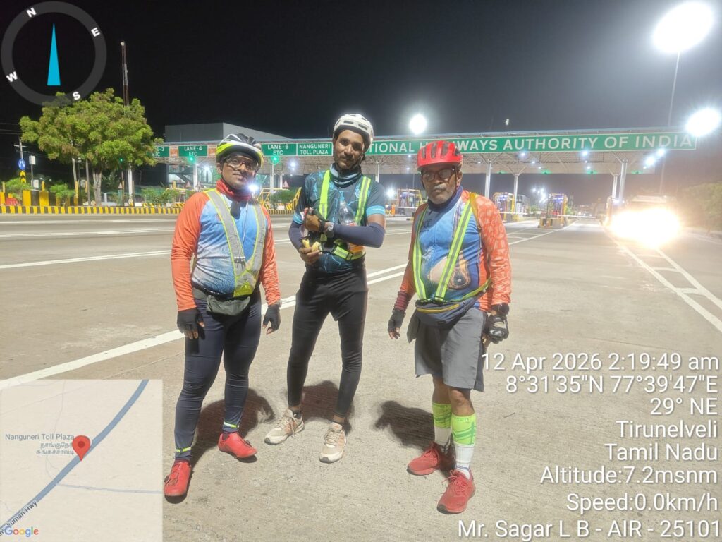 As the day progressed, the heat returned, and we maintained a controlled pace. At an afternoon control point, we took a longer break before starting the final stretch toward Kanyakumari.The last night was challenging due to traffic on flyovers and increasing fatigue. We reached the final control point, about 60 km before the finish, around midnight. After a short rest and refreshments, we started the final leg.