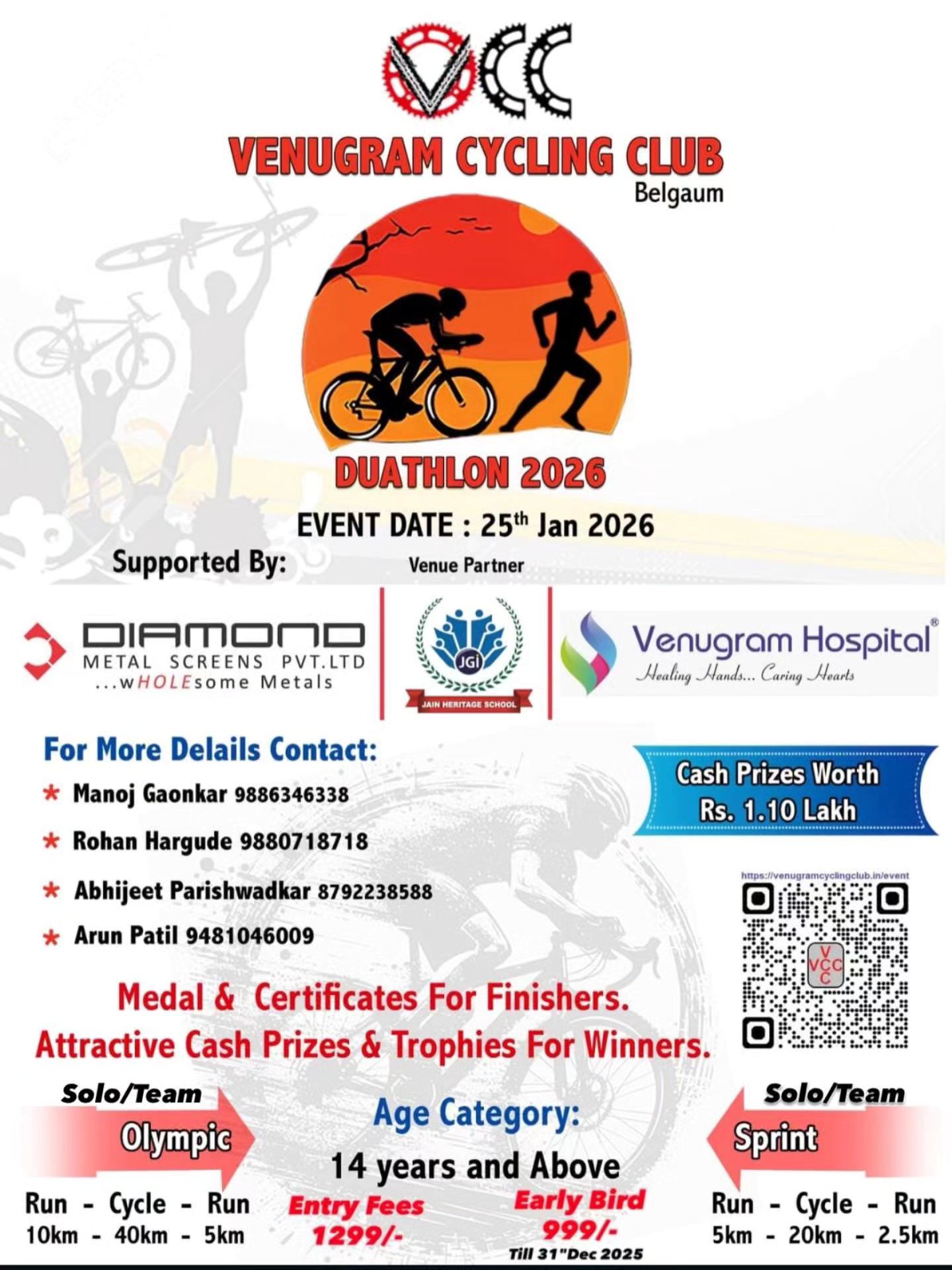 Thank you, Belagavi!Venugram Cycling Club proudly presents Duathlon 2026 — a thrilling test of endurance, speed, and spirit. Whether you’re a seasoned athlete or stepping into multisport for the first time, this Run–Cycle–Run challenge is designed to push your limits and celebrate your passion for fitness. With exciting categories, big rewards, and the unmistakable VCC ... Read more